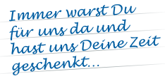 Schreiben Sie hier biographische Stichpunkte, kleine Anekdoten oder charakteristische Merkmale des Verstorbenen auf und machen Sie so die wichtigsten Facetten seines Lebens sichtbar.